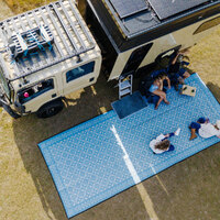 The larger mat, measuring 2.4 x 6m, offers ample space for families to gather, whether it's for meals, games, or relaxation. This size is a popular size in our caravan annex mat menu. Despite its generous proportions, this mat remains lightweight and portable at just 7kg. The tight weave gives you a barrier against the ground underneath, whilst still encouraging airflow, maintaining the integrity of your surroundings. Equipped with secure eyelets for pegging down if required, and paired with a robust recycled polyester carry bag, this mat is your go-to for outdoor comfort.