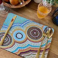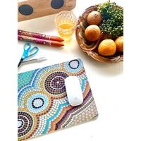 Printed in South Australia on a material made from recycled car tyres and PET plastics, these incredibly vibrant and durable mats add colour and culture to any office, dining table, art station or caravan.