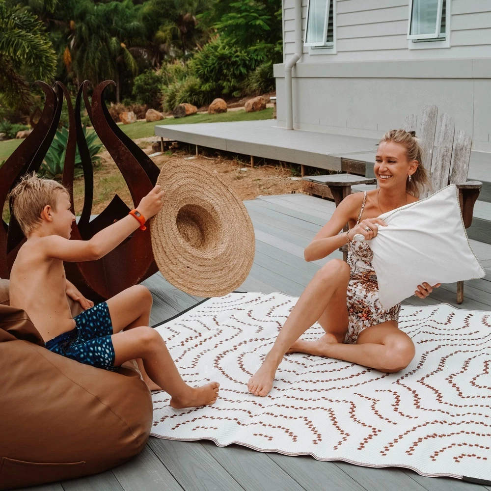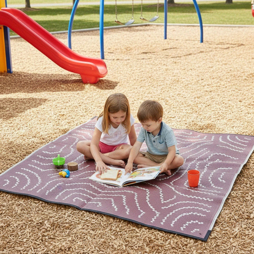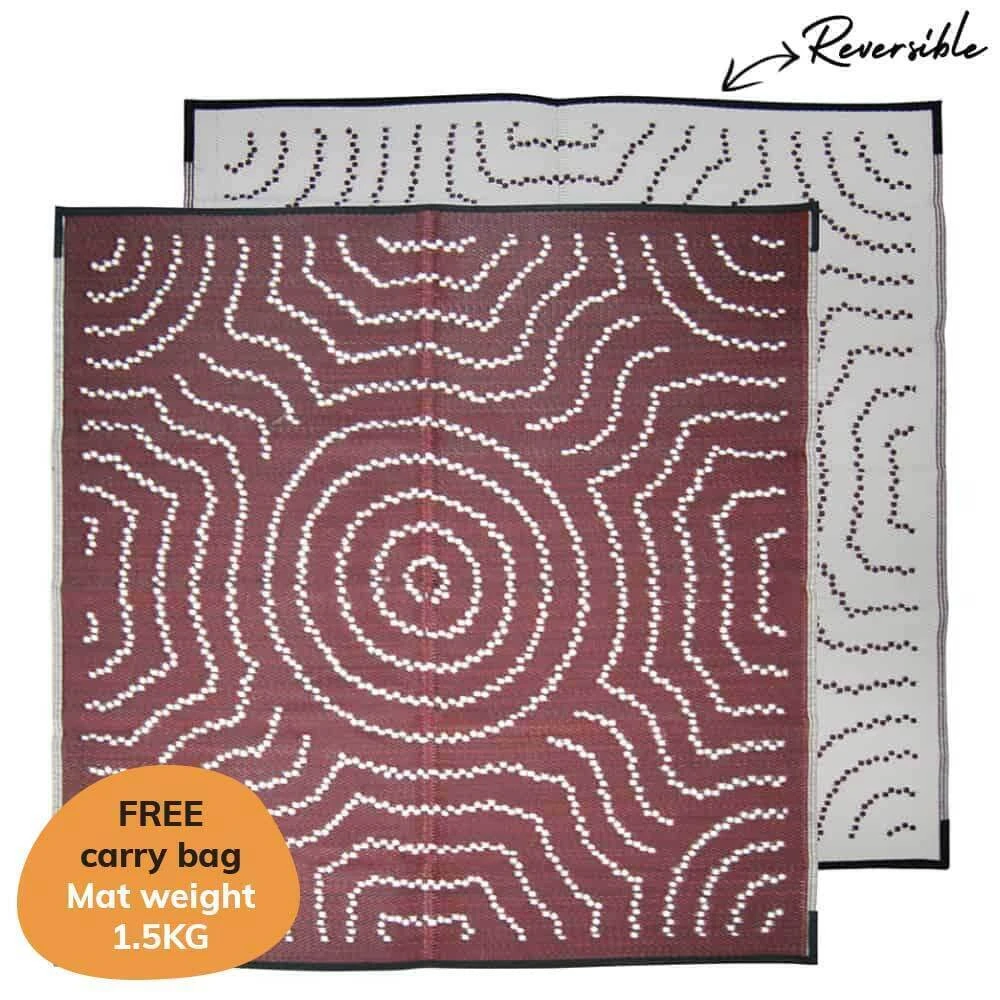 'Water Dreaming' Aboriginal design mats in warm red and white provide perfect outdoor ground cover for any occasion, from the classroom to the campsite.  You can also take them inside, to designate play zones or perhaps a lego mat.