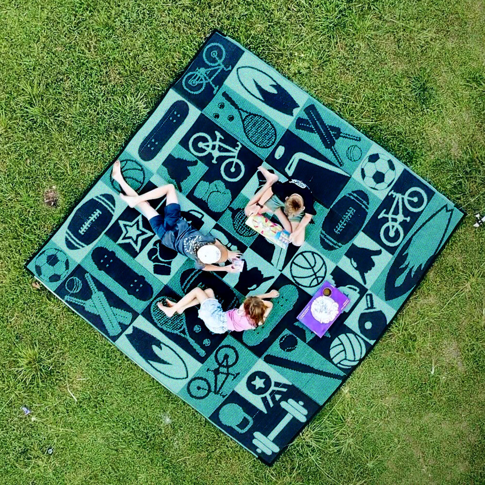 Whether you're cheering from the sidelines, setting up for a backyard match, or just love the energy of the game, this sport-themed recycled mat is the perfect companion. Designed with an assortment of sporting equipment woven into its pattern, it celebrates the passion and excitement of sport in a way that’s both stylish and practical. Take it to the park, the game, or your next outdoor adventure – it's made to move with you!