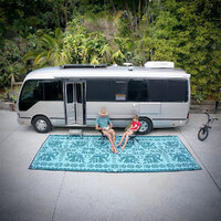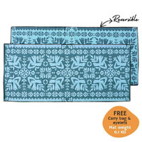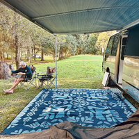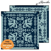 The larger 5m mat, in shades of teal, offers ample space for precious moments with family & friends. Ideal as a caravan annex mat, it effortlessly expands your outdoor living area. It comes complete with 6 eyelets for tie-down purposes and a zip-up carry bag made from recycled polyester. The 3 x 3m navy & teal mat, weighing approximately 4kg, is your perfect companion for picnics, beach lounging, or as a practical layer beneath your beach cabana or gazebo (just include the optional umbrella eyelet for ease of use!). This mat also comes in its own recycled plastic carry bag, making it super portable.